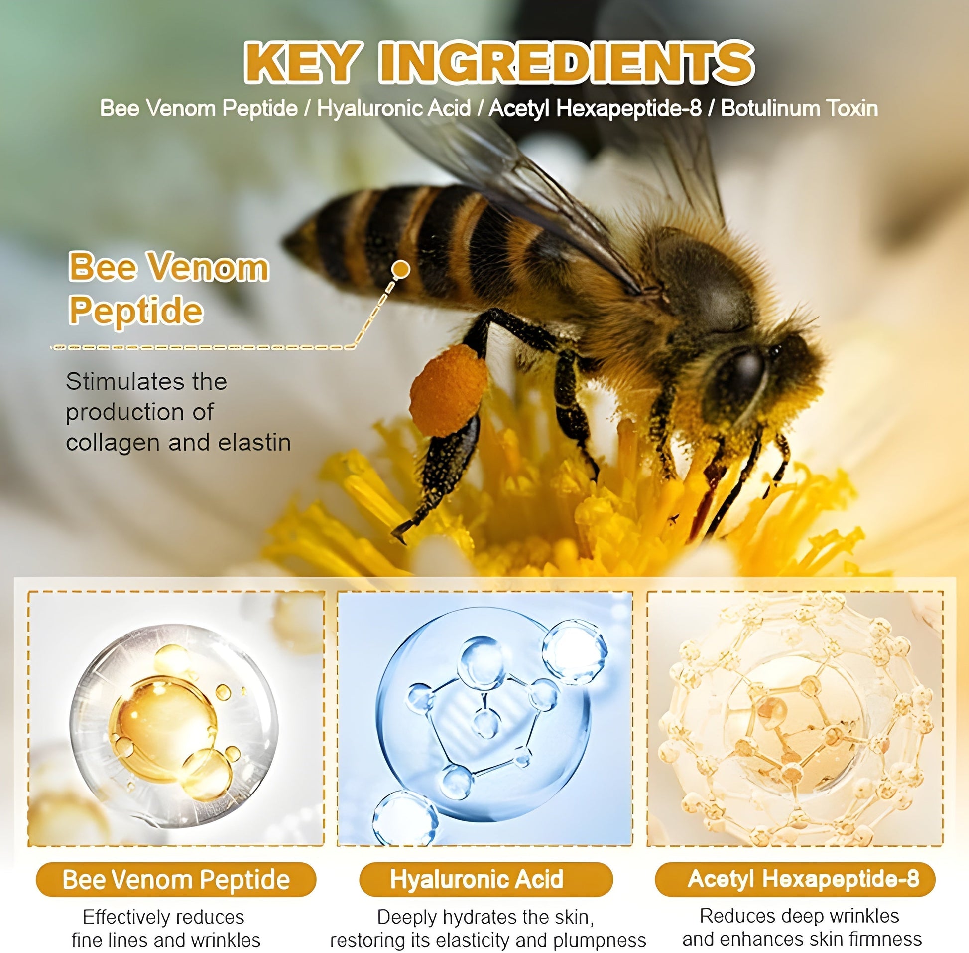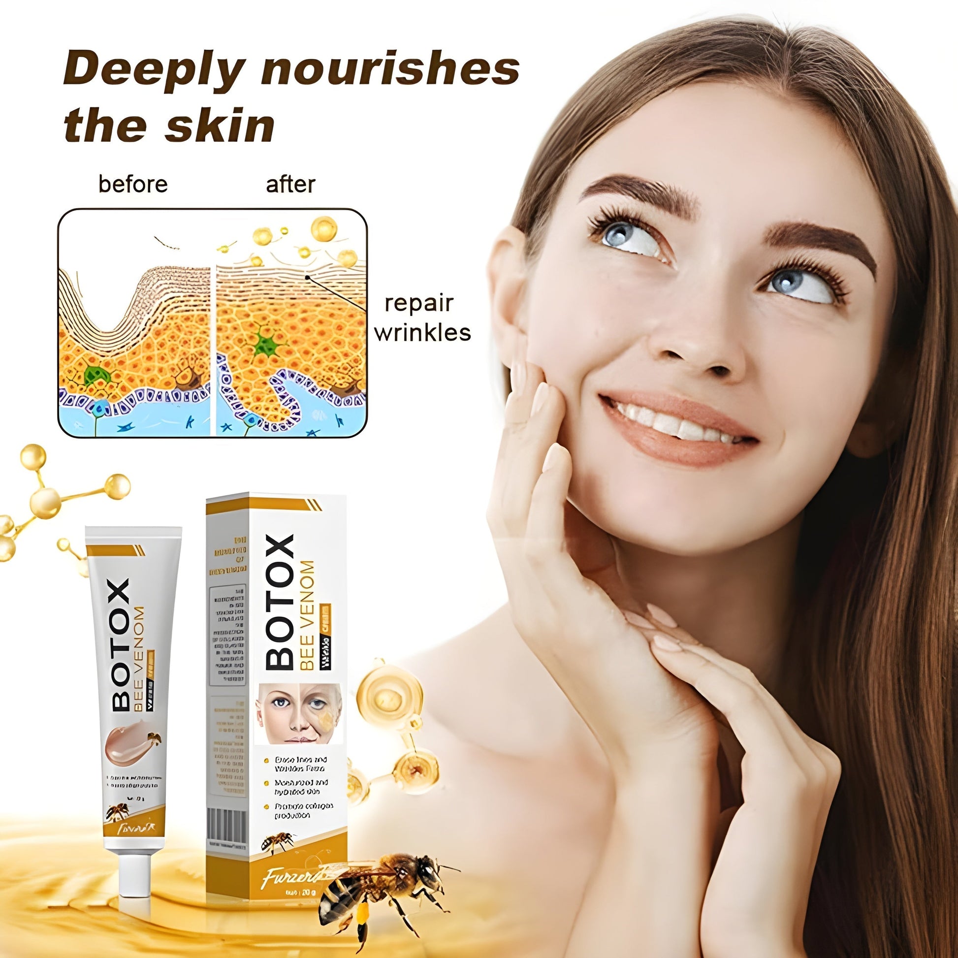 - Erase Lines & Wrinkles: Bee venom peptide complex relaxes facial muscles to visibly reduce fine lines